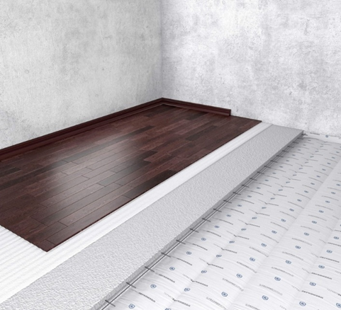 Защита от ударного шума строится по принципу «масса-пружина-масса». Для этого на плиту перекрытия (с заходом на стены) укладывается вибродемпфирующий материал, а сверху заливается тяжелая стяжка. Поскольку стяжка не связана ни со стенами, ни с основанием, она называется «плавающей».