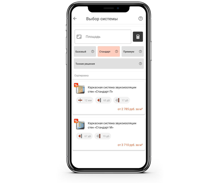 Пользователю остается только указать площадь звукоизолируемых поверхностей и получить подробную смету с финальной стоимостью.